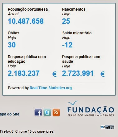 Fui ao site Pordata, da Fundação Francisco Manuel dos Santos, um site útil para encontrar dados de outras entidades, mas todos reunidos num único local. Eis senão o meu espanto, quando constato [conforme podem ver no site, ou na imagem abaixo, de que fiz print screen] que no canto inferior direito está um contador com dois indicadores, supostamente em tempo real: Despesa pública com educação [Hoje]; e Despesa pública com saúde [Hoje]. É esta a independência de vínculos políticos, partidários, religiosos e económicos da Fundação Francisco Manuel dos Santos?! Não sou idiota, ignorante, naïf, ao ponto de pensar que sim, que a Fundação Francisco Manuel dos Santos, é independente seja do que quer que for. Só não gosto que gozem com a minha cara. O mínimo que se exige é que estejam calados. Hipócritas.
