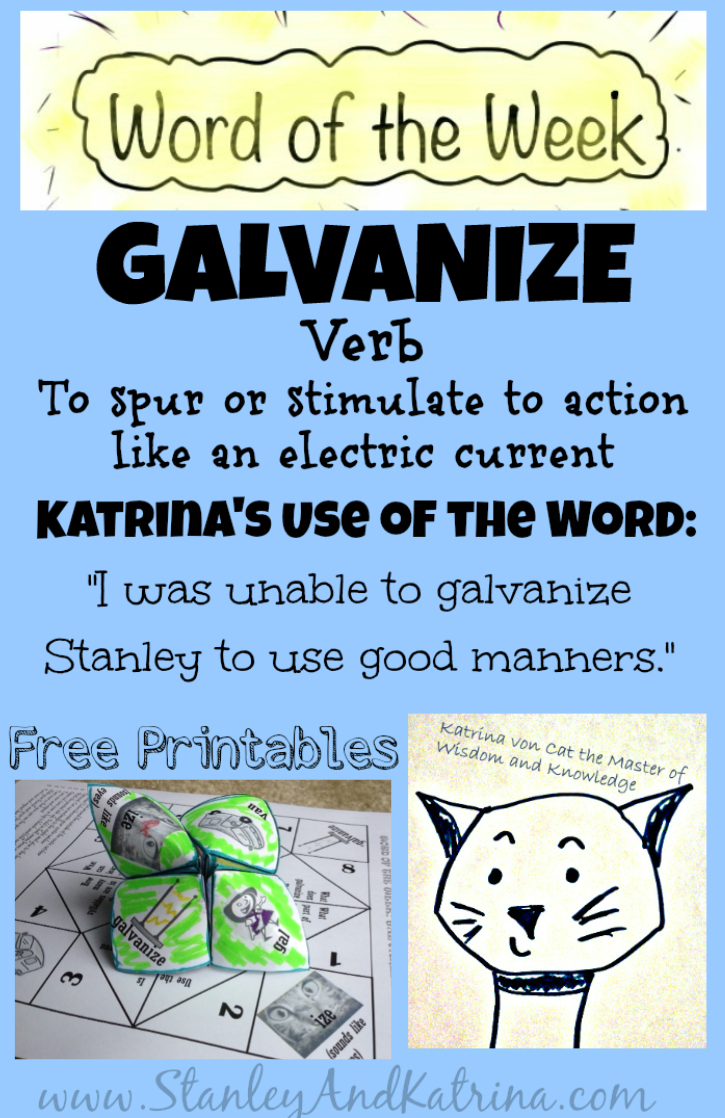 Now tell us, how will you use the word GALVANIZE this week? Have you seen it used anywhere? Is your school using these words? What fun activities do you have for the word? I want to know and so do my friends - please share your creations and let us know if you are using our printables - that makes us happy! If you and/or your family completes an activity, we would love to see a picture of it, or hear all about it. You may do this in the comments below; on our Facebook page; on Twitter (use the hashtag #kidlitwow); pinterest; Google+ - truly, anywhere you want to tell the world with gusto!