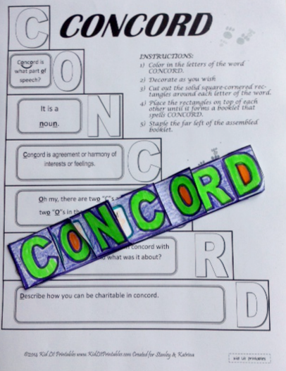 CONCORD printable Word of the Week Instruction CubeWord of the Week Blank Page to Fill OutNow tell us, how will you use the word CONCORD this week? Have you seen it used anywhere? Is your school using these words? What fun activities do you have for the word? I want to know and so do my friends - please share your creations and let us know if you are using our printables - that makes us happy! If you and/or your family completes an activity, we would love to see a picture of it, or hear all about it. You may do this in the comments below; on our Facebook page; on Twitter (use the hashtag #kidlitwow); pinterest; Google+ - truly, anywhere you want to tell the world with gusto!