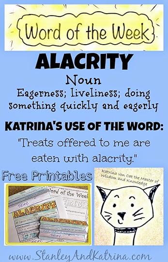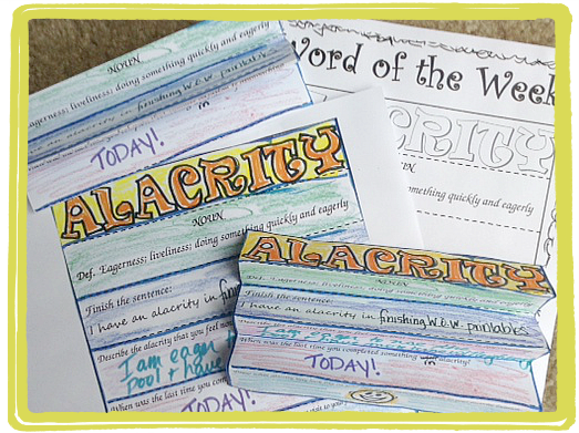 ALACRITY printable Word of the Week Instruction CubeWord of the Week Blank Page to Fill OutNow tell us, how will you use the word ALACRITY this week? Have you seen it used anywhere? Is your school using these words? What fun activities do you have for the word? I want to know and so do my friends - please share your creations and let us know if you are using our printables - that makes us happy! If you and/or your family completes an activity, we would love to see a picture of it, or hear all about it. You may do this in the comments below; on our Facebook page; on Twitter (use the hashtag #kidlitwow); pinterest; Google+ - truly, anywhere you want to tell the world with gusto!