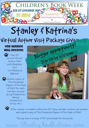 Prize: One winner will receive a 20 minute virtual author visit with Neighbor Girl (of Stanley&Katrina) via Skype or Google+ Hangouts for the group of their choice (classroom, family, homeschool group, etc.) AND a Kindle copy of The Perpetual Papers of the Pack of Pets for every member of the group.* If the winner is located within the US, they will also receive one print and signed copy of The Perpetual Papers of the Pack of Pets.
