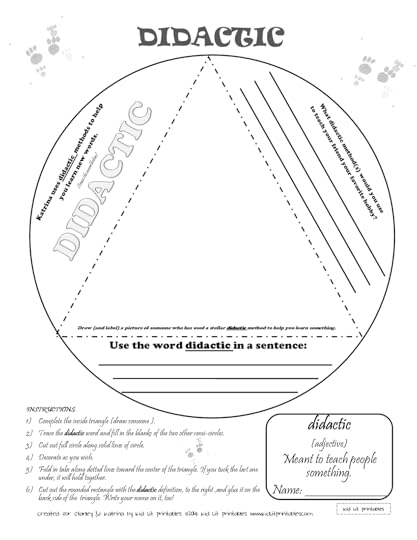 Now tell us, how will you use the word DIDACTIC this week? Have you seen it used anywhere? Is your school using these words? What fun activities do you have for the word? I want to know and so do my friends - please share your creations and let us know if you are using our printables - that makes us happy! If you and/or your family completes an activity, we would love to see a picture of it, or hear all about it. You may do this in the comments below; on our Facebook page; on Twitter (use the hashtag #kidlitwow); pinterest; Google+ - truly, anywhere you want to tell the world with gusto!