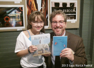 This is the incredibly talented, Matt Phelan. He illustrated/authored the beautiful graphic-novel , Bluffton. Bluffton illustrates a story about three summers in the life of a young Buster Keaton as seen through the eyes of a fictional summer friend. Neighbor Girl purchased Bluffton and was lucky enough to have Mr. Phelan sign it at the Lititz Kid-Lit Festival, after attending his session, "Buster Keaton through the eyes of illustrator Matt Phelan." Thanks to Erik of This Kid Reviews Books for inviting them to this special day!