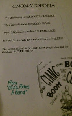 A fun way to introduce onomatopoeia: allow your child to come up with their own word-sounds. She had so much fun finishing these sentences.