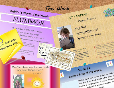 Our Week in Review: Katrina von Cat the Master of Wisdom & Knowledge's Word of the Week: FlummoxQuote of the Week, SeussStanley's Animal Fact of the WeekZorg's Lesson. Alien Languages: Martian, Lesson 5We visited the Philadelphia ZooCool Mom shared a Lapbook of The Glorious Flight Over 5,000 views to our blog to date. Popcorn filled us in on the news and said that for two pets who didn't really get serious about blogging until the end of December, that we are doing well. If I picture how many treats 5,000 is - that makes me excited. Very Inspiring Blogger. Cool Mom was given/nominated for the Very Inspiring Blogger Award for our website by the amazing mom, Lisa from Squishable Baby. We have been a bit slow to share this news. ANYWAY, Way to go, Cool Mom - thank you for getting the word out about us EVERYWHERE. Stanley and I visit the Squishable Baby website as much as Cool Mom does - it is a lovely site and most definitely very inspiring. She makes comfy clothes for little ones; shares her adventures in homeschooling (guess what she is reading now?); as well as many other great topics. We are happy we have had the pleasure of getting to know her and her family virtually. Maybe in the upcoming weeks, we'll get Cool Mom to follow-through on the award requests (sharing about herself and nominating others).Taking the summer off - Stanley and I are discussing taking the summer off from any formal scheduled blog posts and daily updates. We'll still let you know if something exciting happens but we plan to focus on finishing our second book and relaxing a little. Tentative hiatus: June - August. Thank you for reading and sharing,