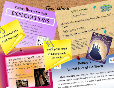 Our Week in Review: Katrina von Cat the Master of Wisdom & Knowledge's Word of the Week: ExpectationsQuote of the Week, Roald DahlStanley's Animal Fact of the WeekZorg's Lesson. Alien Languages: Martian, Lesson 1Help Zorg with his Machinima EntryKid Lit Blog Hop #13, Book Review: 5 Stars to an Enchanting Adventure StoryEnter Jemima's A to Z GiveawayNeighbor Girl will attend the Lorane Elementary School Fun Day on April 20th - mark your calendar!Our book is in the #22 spot for best rated books in the top 100 Kindle Children's Pet Books. Our paws are dancing!
