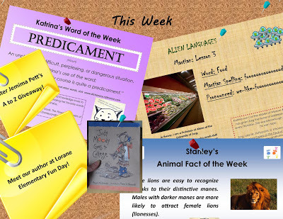 Our Week in Review: Katrina von Cat the Master of Wisdom & Knowledge's Word of the Week: PredicamentQuote of the Week, Fred Rodgers: HelpersStanley's Animal Fact of the WeekZorg's Lesson. Alien Languages: Martian, Lesson 3Kid Lit Blog Hop #14, A Super Cute Review of Judy Moody Goes to CollegeEnter Jemima's A to Z Giveaway!Neighbor Girl will attend the Lorane Elementary School Fun Day on April 20th - tomorrow!Another 5 star review received on Amazon: "Highly original. Very entertaining. A great fun 'tail' that delves into the minds of ... a dog ... and a cat." Thank you for reading and sharing,