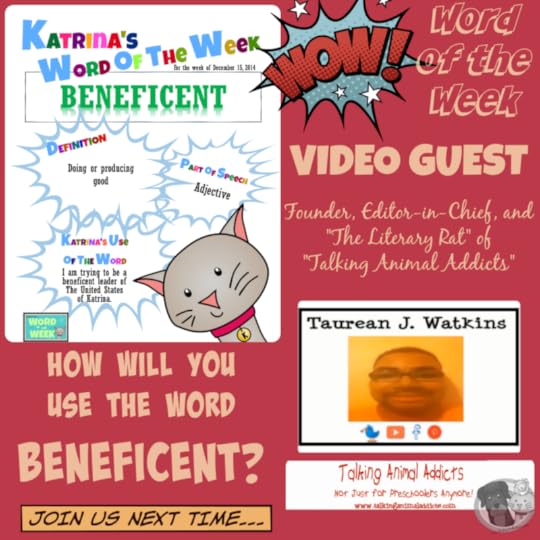 Author and "The Literary Rat," Taurean J. Watkins, and his friend Gabriel are our paw-riffic video guests, this week. Thank you, Taurean and Gabriel for introducing this week's word of the week: BENEFICENT.
