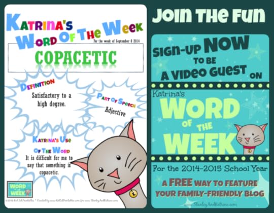 Don't forget that we have free printables to go along with the Words of the Week. Visit Kid Lit Printables to download them now.If you and/or your family completes an activity, we would love to see a picture of it, or hear all about it. You may do this in the comments below; on our Facebook page; on Twitter (use the hashtag #kidlitwow); Pinterest; Google+ - truly, anywhere you want to tell the world with gusto!