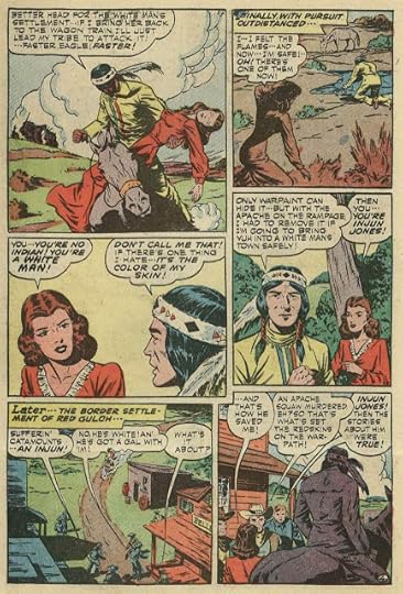 Injun Jones, a white kid raised to maturity by an Indian tribe, hung out in the pages of ACG's BLAZING WEST title for a while. The name sounds a bit inspired by Mark Twain's "Injun Joe" character in TOM SAWYER. I bet he was more consistent than the Apache Kid about maintaining his "redskin" appearance with the use of "warpaint."