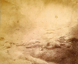 After the sun went down, and the fighting ended for the day, exhausted soldiers would hear appalling sounds coming from the battlefield as they tried to sleep. Moans and cries of the wounded frightening to hear, frightening because it was unthinkable to believe such sounds could be made by a human. These sounds were far more than mere shouts for help and calls for water. But soldiers wrote in their diaries that a no less harrowing sound heard coming from the battlefield at night was a low hum. This hum was made by wounded men holding back the sound of their suffering by keeping their mouths tightly shut, and by wounded men too weak to give greater sound to their agony.Federal dead after the first day of Gettysburg. Photographer, Timothy O'Sullivan, 1840-1882. Library of Congress.