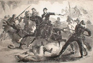 "Nathan spurred Yorktown into the thickest of the fight, where Colonel Bendix and the eight men of the color guard were defending the Regiment's flags against a rush of Confederates. A giant of a Rebel, his eyes wild in his slablike face, came at Nathan with leveled bayonet. Nathan reached for his Colt revolver..."