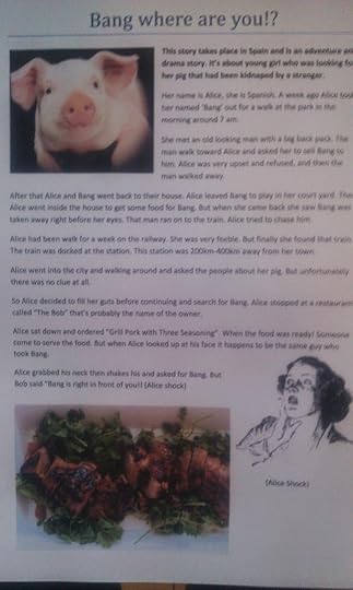 Alice had been walk for a week on the railway. She was very feeble. But finally she found that train. The train was docked at the station. This station was 200km-400km away from her town. Alice went into the city and walking around and asked the people about her pig. But unfortunately there was no clue. So Alice decided to fill her guts before continuing and search for bang. Alice stopped at a restaurant called "The Bob" that's probably the name of the owner.