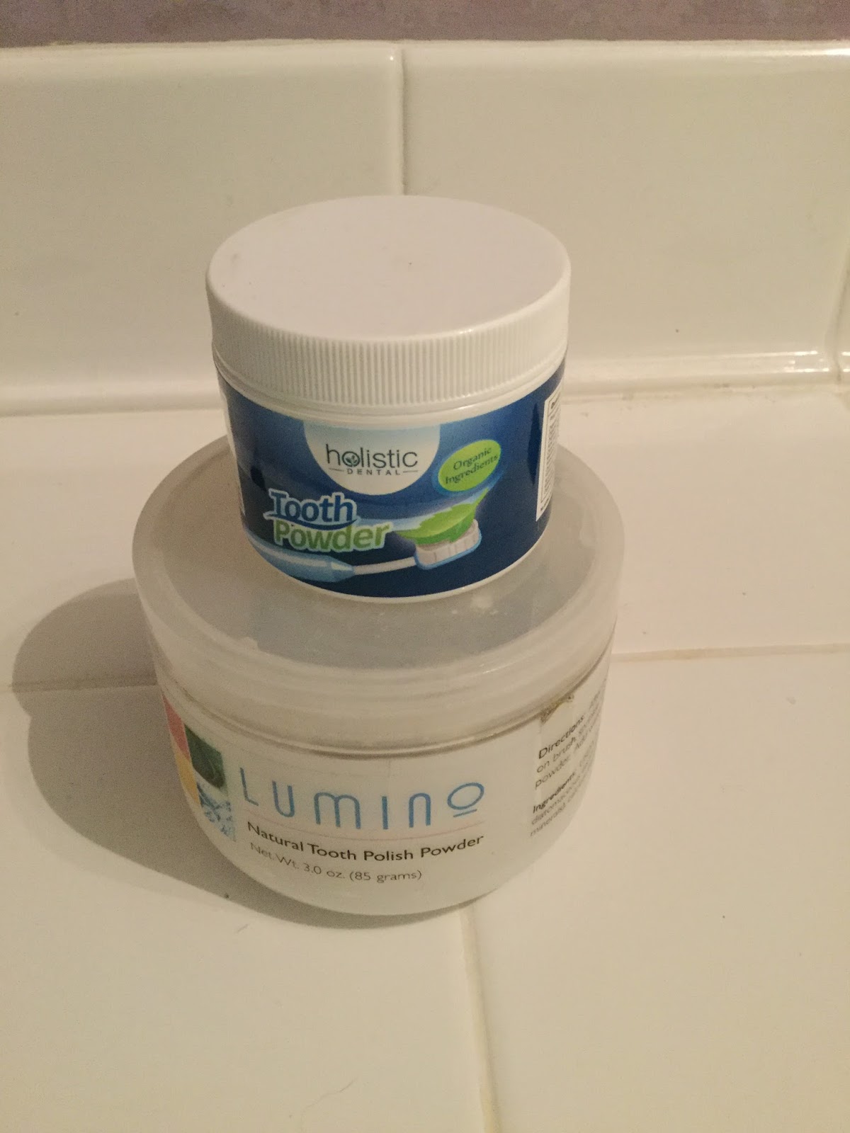 Tooth powders have health benefits as well. After putting some flouride-free toothpaste on my toothbrush, I sprinkle some tooth powder on it. I use Lumino Natural Tooth Polish Powder. It's made of bentonite clay, which makes the pH of the mouth more alkaline to inhibit bacterial growth. And the silica in the bentonite clay promotes stronger bones and teeth. You can purchase it on amazon here.