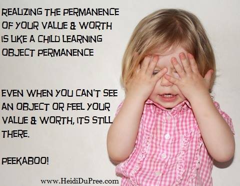 As adults we all understand object permanence, but most of the clients I work with have difficulty with the concept of value permanence. They think that their value is something that increases or decreases depending on what they are accomplishing in their life, or whether people approve of them. But the truth is, your value never wavers. You are always valuable, no matter what. The people in your life don't determine your value. What you "do" doesn't determine your value. You were born valuable and it is permanent. Even when you can't see it or feel it, it's still there. Peekaboo!