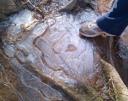 A few winters ago, while walking in the woods, my attention was drawn to the sun shining on this frozen puddle of water at the base of two trees. It almost looked like a heart at its center. As a child, I would step on the ice that had formed across the puddles overnight as I walked to the bus stop on frigid Minnesota mornings. I loved the popping sound as I broke the surface. It was such a delightful way to break something without consequences! So of course I couldn't resist stepping on this ice and popping the surface as well.