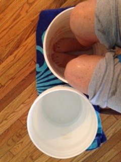 Place the buckets on the floor in front of a chair, with a towel underneath to catch the drops of water as you move your feet from one bucket to the other. Put both feet in the hot water a minimum of 20-30 seconds. Then move your feet into the cold water for the same length of time. If you want to linger longer in either, that is fine. But the goal is to alternate a minimum of 6 times in cold and 6 times in hot. At least once a day.