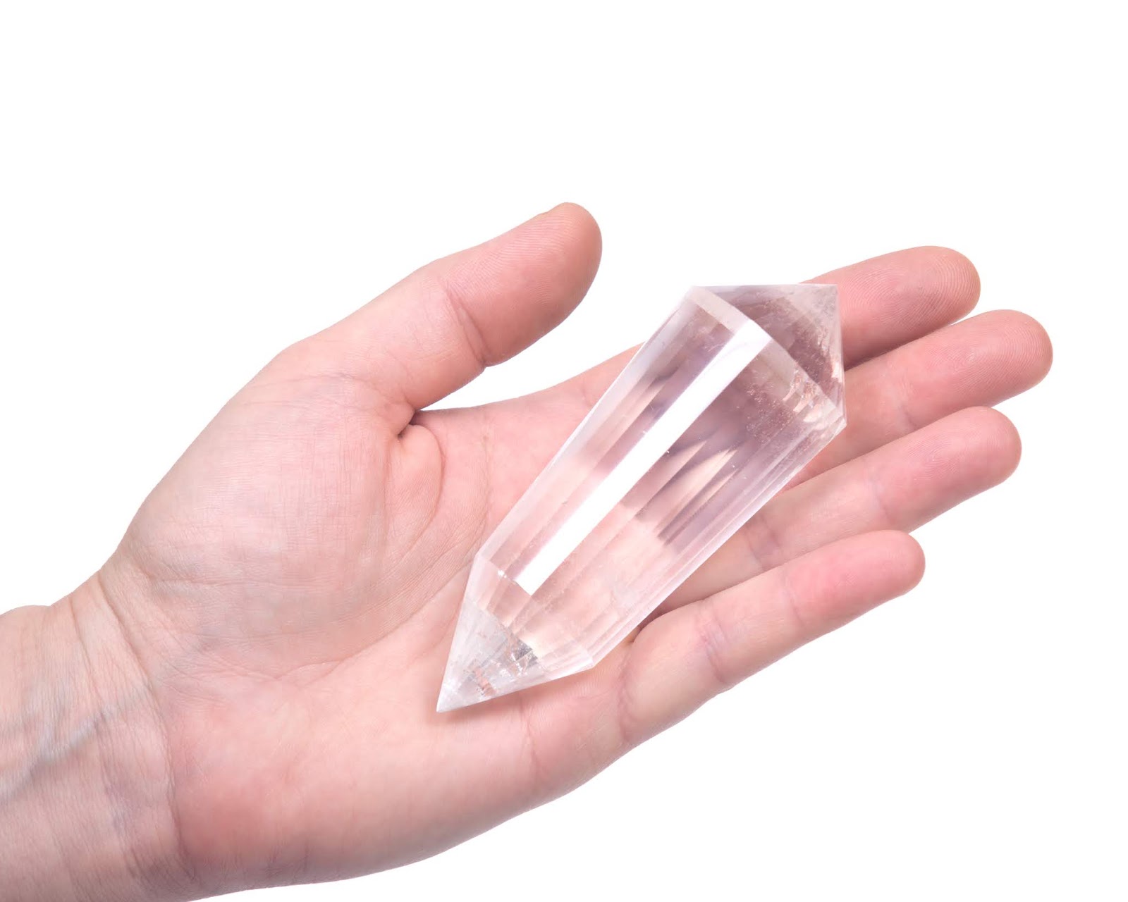 2. Use a crystal. Tuck a double terminated quartz crystal where you might hold a pen or pencil at the top of your ear. This is a crystal that is naturally faceted, or "terminated" on both ends. You will need a crystal smaller than the one pictured below to fit above your ear. If the sounds in your ear are coming from the lower part of your ear, you can tuck the crystal under your ear lobe and tape in place with some cloth tape. After using the crystal in this manner, cleanse the crystal by washing it in water with added epsom salts, or place it in sunlight.