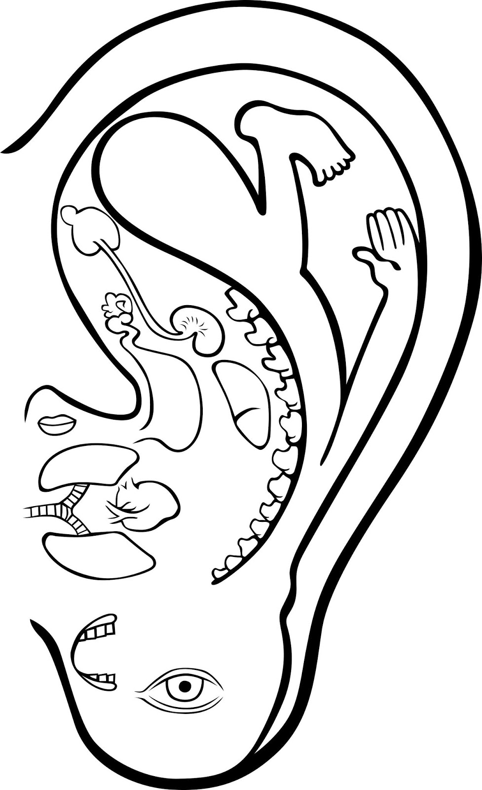 The acupuncture points of the ears form the shape of the human body in miniature. This is known as "the little man in the ear." In The Holographic Universe , author Michael Talbot writes, "Just as every portion of the hologram contains the image of the whole, every portion of the body may also contain the image of the whole." Indeed, the soles of your feet and the palms of your hands contain reflex points for every organ in your body. These reflex points form an outline of the whole body. Healing the whole body by working with these reflex points is the basis of the practice of reflexology.