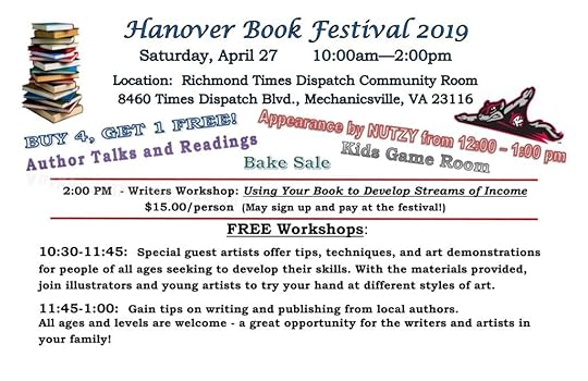 The Hanover Book Festival — Saturday, April 27, 10 a.m. to 2 p.m. at the Richmond Times-Dispatch Building in Mechanicsville, Virginia. Come meet a bunch of Virginia authors!