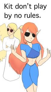Kitten Lovemuch by SoniaHere’s another Second Age of Retha fan art, this time it’s by Sonia and it shows off Kit’s fancy outfits – I love that Sonia included Kit’s fans in this image! And she certainly captured the draping sleeves/skirts and lack of stomach-coverage all of Kit’s outfits embrace. Awesome job!