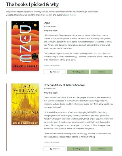 I see Shepherd as a cross between Goodreads, that blog I mentioned, and word of mouth. Plus the website itself is beautifully laid out and provides readers with lists of books recommended by authors themselves. Each recommendation comes with a kind of personalised mini-review, and the whole website just works.