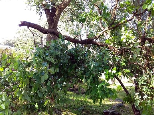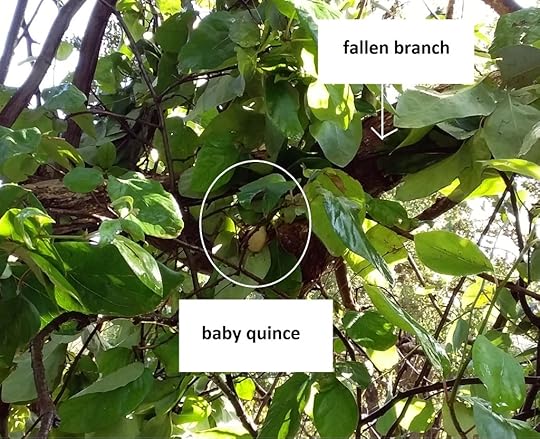 That’s a rather large branch from a Red Box eucalypt. It came to rest right in the middle of my quince tree.