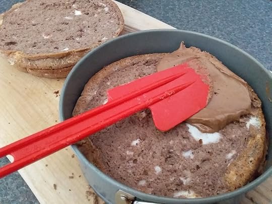 Two homemade chocolate sponge cakes, cut in half. Each layer will be placed in the baking tin and covered with room temperature chocolate mousse. Like this: