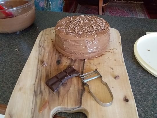 When all the layers are done, including for the top and sides, dark chocolate is shaved over the top: