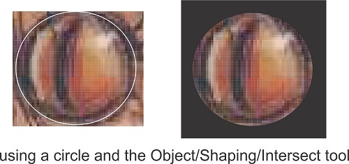 Using the example of the eye again, you draw a vector circle on top of the eye image [white circle on top of left image above]. Next, you select the circle, hold down the Shift key, and select the eye image so you end up with two objects selected.