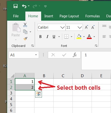 Selecting these two consecutive numbers tells Excel the step order – i.e. 1 + 1 = 2, 2 + 1 = 3, 3 + 1 = 4 etc. If you typed in 10 followed by 20, Excel would know the step order was 10 + 10 = 20, 20 + 10 = 30, etc.