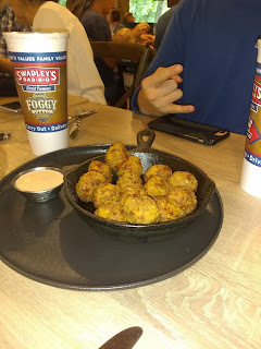 For God's sake, we were in such savage country, the locals even took to eating the Bigfeet (Bigfoots?)! When in Rome, do as the Romans do...We ordered a plate of Bigfoot Balls. While certainly not as ghastly as Rocky Mountain Oysters (nothing is), I imagine there's an entire mountain full of castrated and angry Bigfoot guys roaming around.