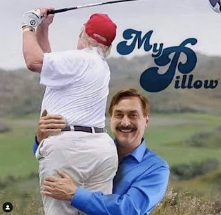 Well, I suppose I can always get a few chuckles from the MyPillow guy. Let's just see what he's up to...okay, three-day symposium offering bonafide proof of foul play, nothing new there... Oh, he's not going to sleep for three days (kind of self-defeating pillow advertising, but whatever) while he's going to stay on stage for 72 hours straight exposing "The Truth." This after he got mad at his (small) audience wanting to break for lunch. Uh-oh...wait...the MyPillow guy just fled the stage after finding out that Dominion is proceeding with their billion dollar defamation suit against him. But, hold on, what fresh new hell is this??? Poor MyPillow guy was accosted that night by two photo-taking evil beings who put their arm around him and pushed a finger into his side causing "agonizing pain." I don't know about you, but a finger in your side is more annoying--kinda a kid brother pestering, say--than agonizing, but, hey, maybe the villain (who Lindell claims was Antifa) had a finger of steel. Or maybe Mike just needs to get that sleep he deprived himself of.