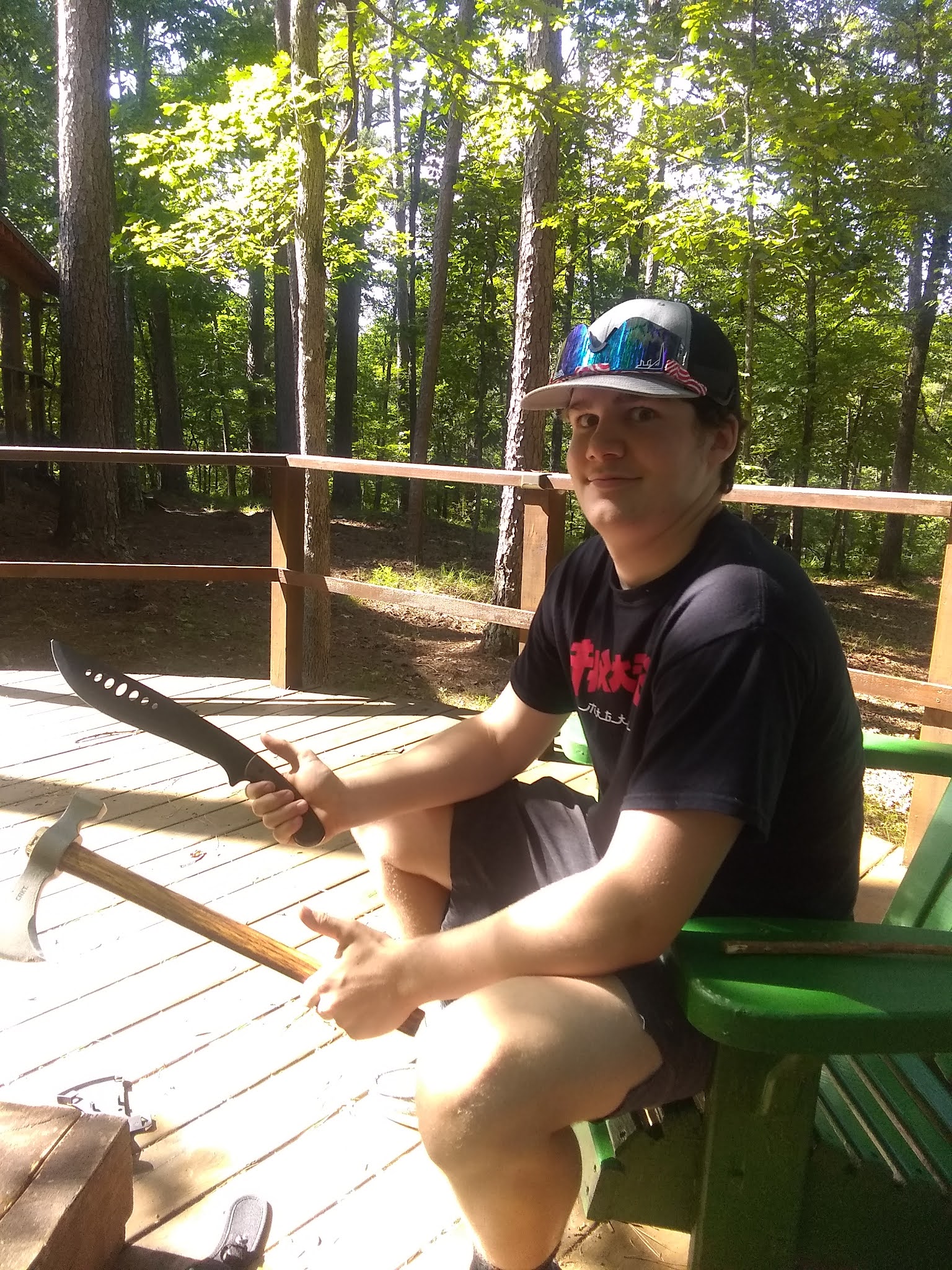 My nephew wielding weapons so as to fend off the deadly Tree FrogsAll week long, my claims of camping were ridiculed. Okay, okay, the cabin had air conditioning and even Wifi, but for God's sake, the signal was really spotty! Talk about roughing it! And sure there were wineries and breweries twenty minutes away to occupy my great outdoors-man daytime activities, but at night, a myriad of critters, varmints, and who-knows-what buzzed, clicked, shrieked, hooted, hawed, cawed, and laughed. Camping!