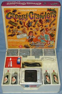 The '60's and '70's were a great time to be a kid. We had ovens galore, lawn darts (which had a tendency to end up in the neighbors' cat), Slinkies (kids LOVE playing with a sharp, curled wire), chemistry sets (my parents banned me from them after the second time I set off a sulfur bomb in the house--FUN!), Clackers (two glass balls tied to strings that you'd swing around like nunchuks until they exploded glass shards everywhere), Creepy Crawlers (yet another blast with highly erratic mini-ovens where you'd pour goop into blistering hot molds to make jiggly bugs), Slip 'N Slides (more appropriately called "Slip 'N Concussions"), Stretch Armstrong action figures (not "dolls," dammit!), a figure filled with unspeakable liquid that no kid could resist to puncture after the first day to see what Stretch was really made of, and so much more. And of course, the awesome Super Elastic Bubble Plastic, where you could put a dab of goo (giving off really toxic fumes!) to blow bubbles. This was fun.