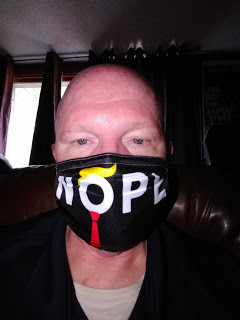 And stop listening to our wondrous president. These days Trump's preaching that people should not wear masks. Recently, NOTUS attempted to bully a reporter into taking his mask off. Trump's rage rallies are full of maskless buffoons (thanks for the thousands of new cases, commander-in-chump!), as he preens onstage like an orange peacock, calling people names and bragging about what a genius he is because he could name a lion on a cognitive test. It wasn't too long ago Trump said wearing a mask was patriotic. But whaddaya expect from a guy who changes his mind by the minute.My preferred mask (even though my wife is afraid for me to wear it in public. I say, "Bring it, fascist cretins!" (Of course, that's before I get beat up in a grocery store.)