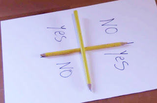 In 2015, social media was responsible for spreading a variation called ‘Charlie Charlie’. The only equipment needed for this game includes two pieces of paper on which the words ‘yes’ and ‘no’ are written, plus two pencils. One is placed on top of the other. The pieces of paper with the words, ‘yes’ and ‘no’ are placed one to the right and one to the left of the pencils. ‘Closed’ questions (ones to which only the answer ‘yes’ or ‘no’ is required) are posed. When/if the top pencil pivots right or left, this is interpreted as having established contact with the spirit, in the same way as a moving glass or planchette on a traditional Ouija board.