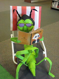 "Well," she says, "this giant bug swooped into my apartment when I opened the door. Scared the tar outta me. He looked like a green bean with a three inch stem and a fan-tail and an awful tiny face. There's a big one and a little one and I can't catch them. They keep going for my hands and my face. But the big one lost his fan-tail since he got in. They're still in here somewhere, though."