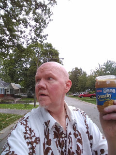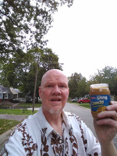 A crazy, screaming, big dumb guy running down the street carrying a jar of peanut butter!