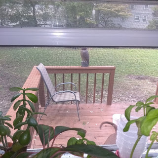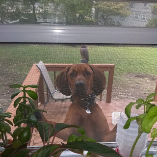 Couple days ago, I kicked both of the lil' debbils outside. The usual hijinx ensued: barking, digging, eating out of the compost pile. Whatever, at least they were entertaining themselves. I took advantage of the brief respite and prepared lunch. In the kitchen, I looked out the window, wondering what hellish tortures they'd newly unleashed on my poor neighborhood. Suddenly--worse than Jason, Freddy or Michael--a small furred face, a supernatural hellhound, popped into the window. I shrieked, not afraid to admit my lack of manliness in the face of terror. Just as suddenly, he vanished! Baron's about eight inches tall. How he made it up to the window is beyond me.