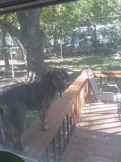 Last Friday, Baron got into the day care yard again. How, I don't know. Naturally the little jerk never comes when called, so the trick is to ignore, then lure him in with food. I let his brah, Merle, inside, thought Baron would come whining at the door like last time.