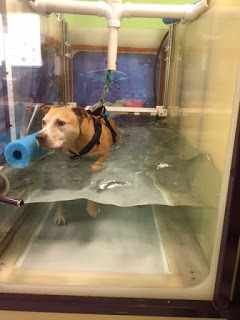 After the "Love-In" portion of therapy was completed, the women lowered Zak into an underwater treadmill. We watched as they enclosed Zak inside a plastic tomb and water started to slowly fill up. Immediately, I thought of Harry Houdini or one of Batman's villain's traps. Then the treadmill started. Aquadog!