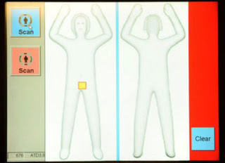 I had to clear my throat several times to be heard, but good sport that I am, I wanted the audience to know I wasn't a terrorist. "Ah...why'd the scan show that?" I pointed, refusing to mention "crotch," "groin," "genitals," amidst the crowd.