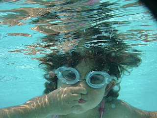 But once I stepped through the portal of Hell, everything changed. A little, roundly cherubic girl--possibly 8 or 9--stood up in the hot tub. All the pretty, pretty pinks and oranges and yellows of a princess's world adorned her swim-gear. A cutesy little fringe encircled her formidable belly. Duckies blissfully swam across her midriff. Tight green swimming glasses cut off her head's circulation, puffy sun-burned cheeks cementing them into place. Apparently thrilled to see me, she asked, "Are you going to swim?"