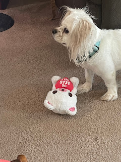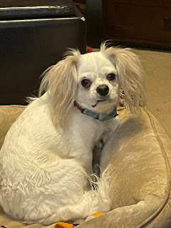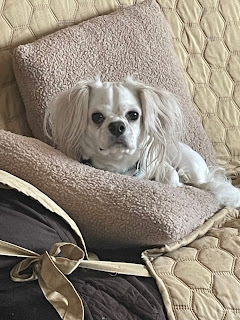 I'm writing this on the third day of our new dog pack. Gone are the mornings of ever hoping to sleep in again. Little time do I have to get anything done, for I'm wrangling dogs 24-7. Also, while I'd always wanted a little lap dog (Mr. Loomis was supposed to fill that role, but made it clear early on, he is above lapdom, while Bijou--although much too big--dearly wants that role.), the new guy has to be in my lap 24-7. This makes taking the trash out rather difficult.