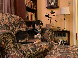 As for the dynamic between the dog pack? It's been rather tricky. Mr. Loomis--a cranky old veteran of 15 years (a dog after my cranky old heart)--chooses to ignore the new guy. Until he intrudes on his territory, then things turn snappish. And Bijou will not tolerate the little fellow coming close while he's getting attention from my wife or me.