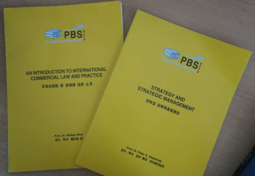 Picture shows booklets in English/Korean that were used at the Pyongyang Business School.