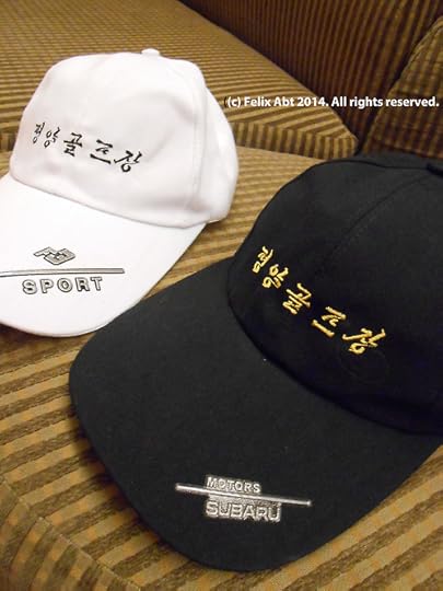 Felix Abt proudly displays his new PYONGYANG GOLF CLUB caps (with additional logos…) recently bought at the Pyongyang Golf Course.