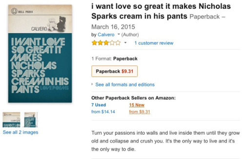 My book of love poems, i want love so great it makes nicholas sparks cream in his pants, is now available on Amazon for under $10. Don’t know how long this will last but if you have ten bucks to completely waste or wanna buy a cheap gift for someone you really don’t wanna be buying a gift for but have to because of social formalities and obligations, get them this hot steaming turd of poetic absurdities while supplies last!