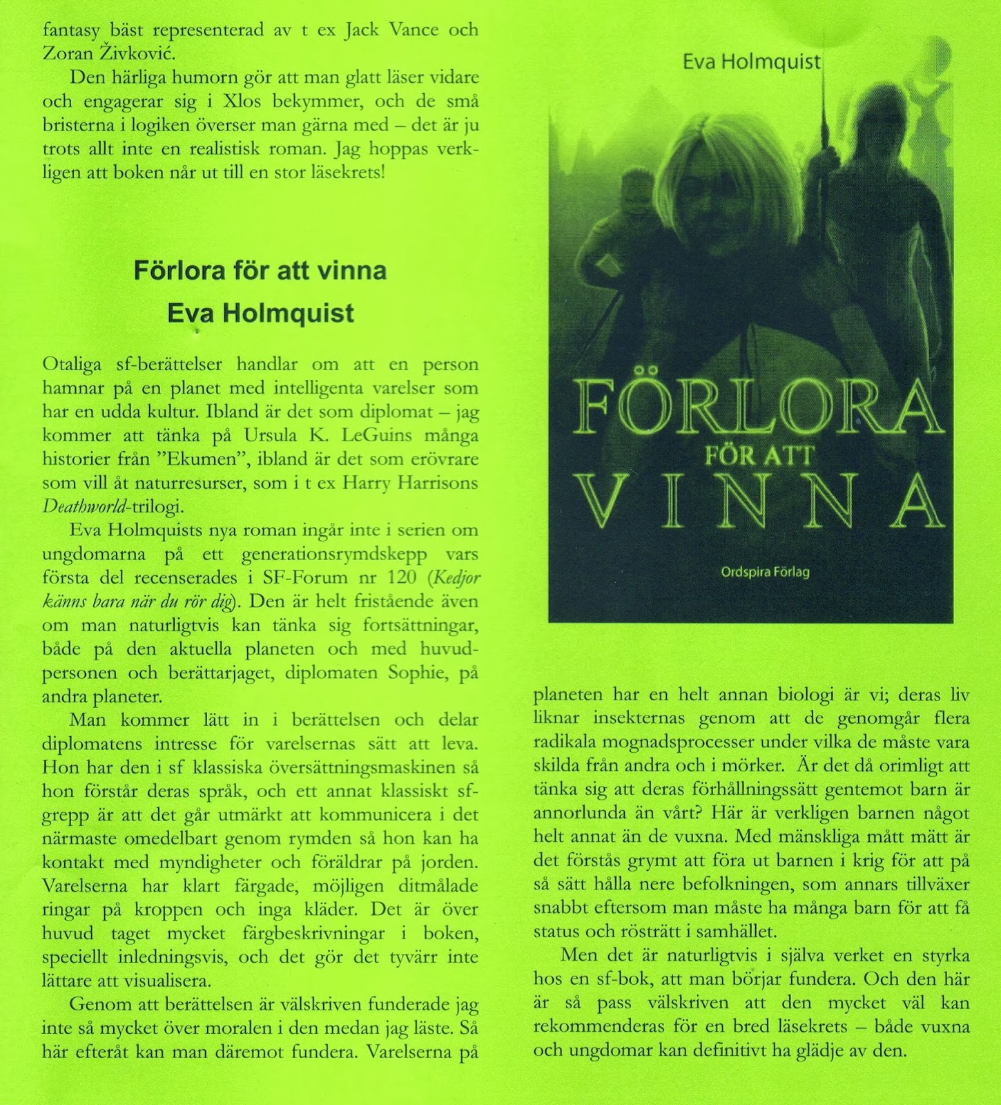 Det är Tomas Cronholm som för SF Forums räkning recenserat den. Hans recensioner är alltid intressanta, eftersom han ställer boken i förhållande till genren science fiction och jämför med andra böcker. Det är därför extra kul att han gillade Förlora för att vinna.